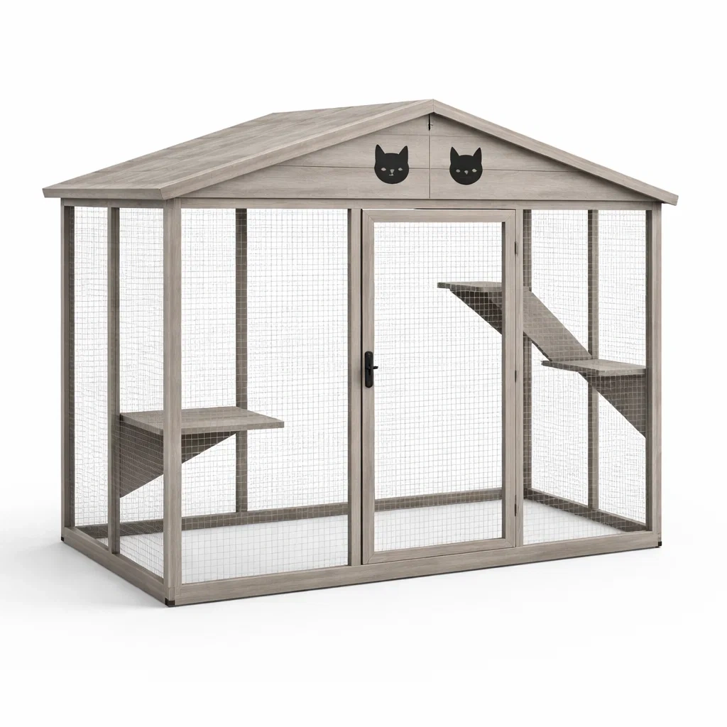 Questa cabina per gatti è realizzata in legno di pino con rete metallica. Offre resistenza alle intemperie e design traspirante.